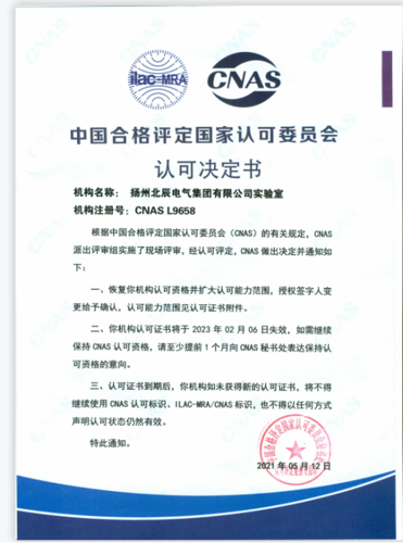 2021年3月9日至10日,CNAS評(píng)審組對(duì)公司實(shí)驗(yàn)室進(jìn)行復(fù)評(píng)及擴(kuò)大范圍認(rèn)可的評(píng)審,并于5月12日獲得CNAS認(rèn)可證書(shū)。CNAS評(píng)審組對(duì)公司實(shí)驗(yàn)室的內(nèi)部評(píng)審、管理體系、風(fēng)險(xiǎn)識(shí)別控制、人員管理等進(jìn)行全面評(píng)價(jià),并針對(duì)實(shí)驗(yàn)室維持長(zhǎng)期穩(wěn)定高效運(yùn)行提出寶貴意見(jiàn)。