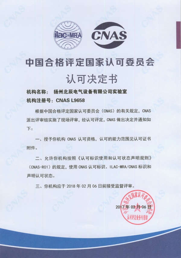 2017年2月6日,揚(yáng)州北辰電氣設(shè)備有限公司實(shí)驗(yàn)室獲得了中國合格評定國家認(rèn)可委員會(CNAS)頒發(fā)的實(shí)驗(yàn)室認(rèn)可證書。
