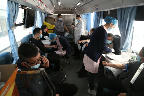 上午八點(diǎn)半,臨時(shí)體檢臺(tái)前等待獻(xiàn)血的員工們?cè)缫炎杂X排起隊(duì),填表、體檢、上車獻(xiàn)血,一切正有條不紊地進(jìn)行,愛心獻(xiàn)血車內(nèi)座無(wú)虛席。