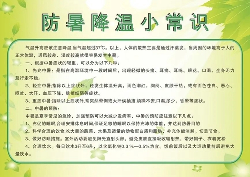 一是加強夏季防暑教育。入夏后,公司特邀揚州市安全生產(chǎn)學會秘書長朱建中針對夏季防火、用電、防暑應急救護等知識開展專題安全培訓,向員工講解防暑降溫的措施和用電等相關安全知識,教育員工做好自我安全保護。公司還在廠區(qū)內關鍵醒目位置還設置防暑降溫知識宣傳展板,并通過微信公眾號推送等形式,做好夏季高溫注意事項溫馨提示。