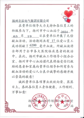 三月春風(fēng)暖人心,雷鋒精神薪火傳。3月19日,揚(yáng)州北辰電氣集團(tuán)有限公司組織開展職工愛心獻(xiàn)血活動(dòng),用實(shí)際行動(dòng)弘揚(yáng)雷鋒精神,踐行企業(yè)社會(huì)責(zé)任,彰顯北辰人的熱血擔(dān)當(dāng)。