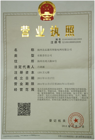 北辰集團子公司揚州通用北辰智能電網(wǎng)工程應用中心有限公司于2014年9月12日將公司名稱變更為揚州北辰通用智能電網(wǎng)有限公司,并已獲得工商行政部門審批核準,相關(guān)執(zhí)照證書均已辦理完畢。